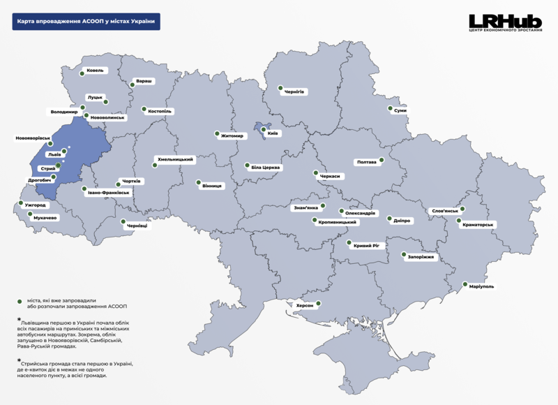 Даний текст передбачає опис становлення та поточного стану впровадження АСООП в Україні. Першочергово було враховано нормативну процедуру впровадження рішення, вартість його реалізації, ким впроваджувалось рішення та терміни реалізації. Для підготовки цього дослідження була використана комплексна методологія, яка включає кількісні та якісні методи аналізу, а також порівняльні методи дослідження. Здійснено огляд міжнародного досвіду впровадження електронного квитка, проаналізовано нормативно-правову базу національного рівня та місцеві рішення, проведено кількісний аналіз цифрових даних та порівняльний аналіз.